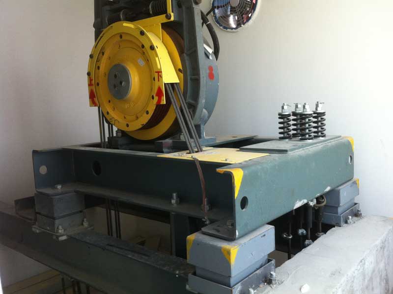 在電梯曳引機(jī)底座加裝分體式金屬減振平臺(tái),將振動(dòng)聲源與地面、四周的墻體做隔離;電梯的主要固體剛性連接替換成軟性彈性連接,削弱剛性連接的傳聲;根據(jù)具體的噪聲情況對(duì)電梯機(jī)房、室內(nèi)等進(jìn)行低頻噪音治理。